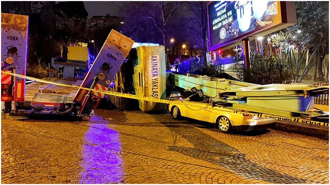 Beşiktaş’ta rampayı çıkmaya çalışan tırın üzerinde bulunan iş makinesi, park halindeki 3 otomobilin üzerine düştü.