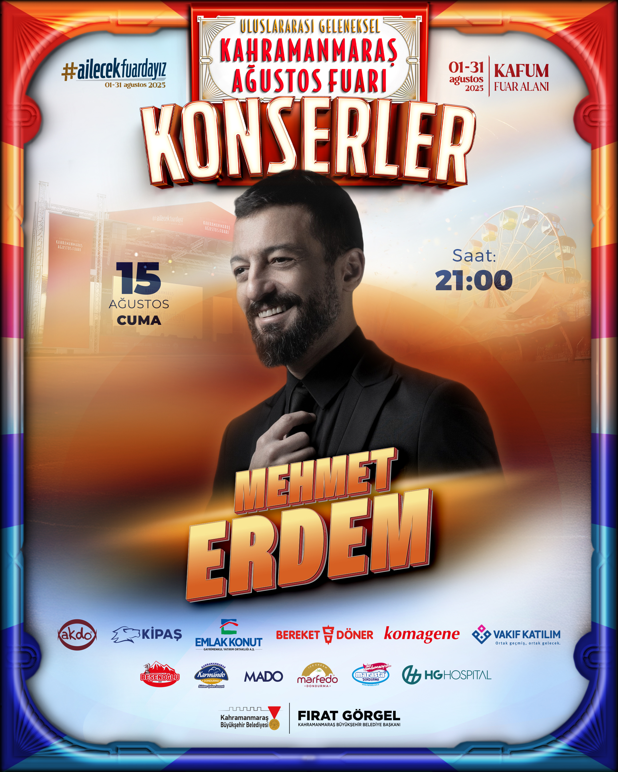 Kahramanmaraş Büyükşehir Belediyesinin düzenlediği Uluslararası Geleneksel Ağustos Fuarı, 15’inci gününde müzik dolu bir geceye ev sahipliği yapacak. Etkinlik takvimi kapsamında 15 Ağustos Cuma günü KAFUM Fuar Alanı’nda, Türk pop müziğin önde gelen isimlerinden Mehmet Erdem sahne alacak. Saat 21.00’da başlayacak konser, müzikseverlere unutulmaz bir gece yaşatacak. Kendine özgü tarzı, etkileyici sesi ve duygusal yorumlarıyla müzikseverlerin beğenisini kazanan Mehmet Erdem; “Hakim Bey”, “Acıyı Sevmek Olur Mu”, “Sen Mutlu Ol Ne Olur”, “Herkes Aynı Hayatta” başta olmak üzere birçok hit parçayı sevenleri için seslendirecek. Büyükşehir Belediyesinden yapılan açıklamada, konsere katılımın ücretsiz olduğu ve tüm vatandaşların davet edildiği belirtildi.