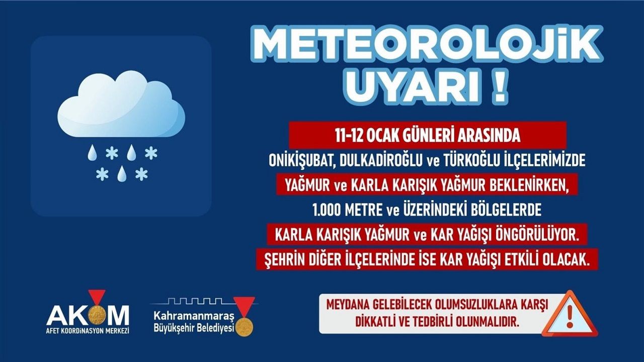 Kahramanmaraş Büyükşehir Belediyesi Afet Koordinasyon Merkezi (AKOM), 11 Ocak Pazar ve 12 Ocak Pazartesi günü şehir genelinde etkili olması beklenen olumsuz hava koşullarına karşı vatandaşları uyardı. Meteorolojiden alınan verilere göre; Onikişubat, Dulkadiroğlu ve Türkoğlu’nda karla karışık yağmur ve zaman zaman kar yağışı beklenirken, rakımı 800 metre ve üzerindeki kesimlerde karla karışık yağmur ve yoğun kar yağışı öngörülüyor. Diğer ilçelerde ise yoğun kar yağışı bekleniyor. Olumsuz hava koşulları nedeniyle meydana gelebilecek ulaşımda aksamalar, buzlanma ve don riskine karşı dikkatli ve tedbirli olunması noktasında vatandaşlar uyarıldı.