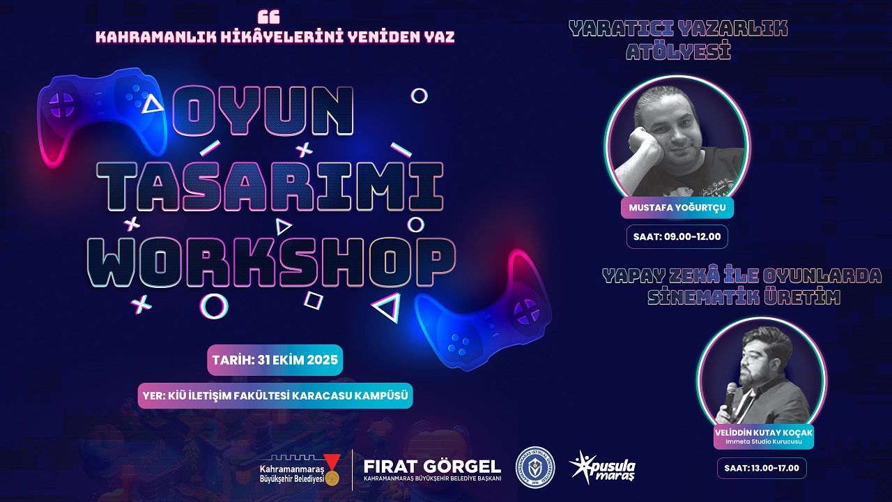 31 Ekim Cuma günü düzenlenecek Oyun Tasarım Atölyesi, Kahramanmaraş İstiklal Üniversitesi İletişim Fakültesi Karacasu Kampüsü’nde 09.00 – 17.00 saatleri arasında gerçekleştirilecek. Gün boyu sürecek etkinlikte, katılımcılar farklı disiplinlerden uzmanlarla bir araya gelerek hem teorik hem de uygulamalı çalışmalar gerçekleştirecek. Atölyeye katılmak isteyen gençler, https://kahramanmaras.bel.tr/duyuru/2025/10/22/oyun-tasarimi-atolyesi-basvuru-formu adresi üzerinden çevrimiçi başvuru yapabiliyor.