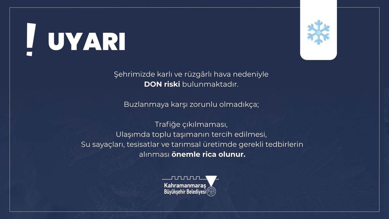 Kahramanmaraş Büyükşehir Belediyesi, şehir genelinde etkisini sürdüren olumsuz hava koşullarına ilişkin vatandaşları uyardı. Yapılan açıklamada, özellikle gece saatlerinden itibaren hava sıcaklıklarında ciddi düşüş yaşanmasının beklendiği, kuvvetli rüzgârla birlikte buzlanma ve don olaylarının etkili olabileceği belirtildi. Meteorolojik veriler doğrultusunda hava sıcaklıklarının mevsim normallerinin altına düşeceği ifade edildi. Açıklamada, buzlanma riskine karşı zorunlu olmadıkça trafiğe çıkılmaması, özel araçlar yerine toplu taşıma araçlarının tercih edilmesi çağrısında bulunuldu. Büyükşehir Belediyesi ekiplerinin olası olumsuzluklara karşı sahada çalışmalarını sürdürdüğü belirtilirken, tuzlama ve solüsyon uygulamalarının özellikle ana arterler, köprüler, üstgeçitler ve yokuşlu bölgelerde yoğunlaştırıldığı kaydedildi. Açıklamada ayrıca vatandaşların bireysel önlemler almasının önemine dikkat çekilerek, su sayaçları ve açıkta bulunan tesisatların don riskine karşı korunması gerektiği vurgulandı. Tarımsal üretimle uğraşan çiftçilere de uyarıda bulunularak, don olaylarına karşı ürünlerin ve seraların gerekli tedbirlerle güvence altına alınması istendi.